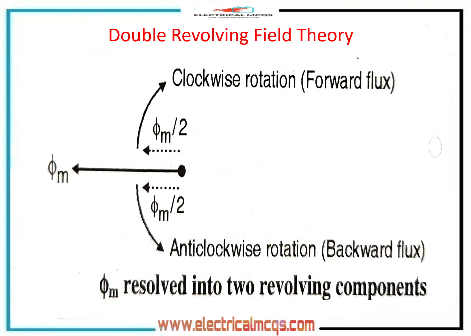 The double-revolving field theory states that any alternating quantity can be resolved into components that rotate in the opposite directions to each other with each one having a magnitude that is half of the peak magnitude of the alternating quantity.